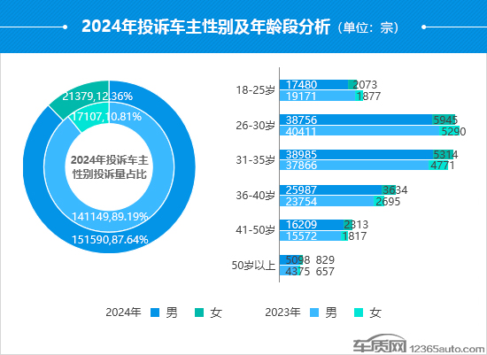 從2024年投訴車主性別占比來看,男性車主雖然仍是投訴主體,但投訴占比較2023年略有下降。相比之下,女性車主針對汽車問題的維權(quán)意愿有所增強(qiáng),2024年的投訴占比達(dá)到了近9年來的最高點(diǎn)。此外,2024年投訴車主年齡段仍集中在26-35歲之間,但占比較2023年略有下降。36-40歲的中年車主成為新的投訴增長點(diǎn),其中,女性車主的投訴漲幅超過了同期的男性車主,同比上漲34.8%。從投訴類型來看,36-40歲的女性車主對于服務(wù)問題更為關(guān)注,投訴占比較2023年提高了3.6個百分點(diǎn)。