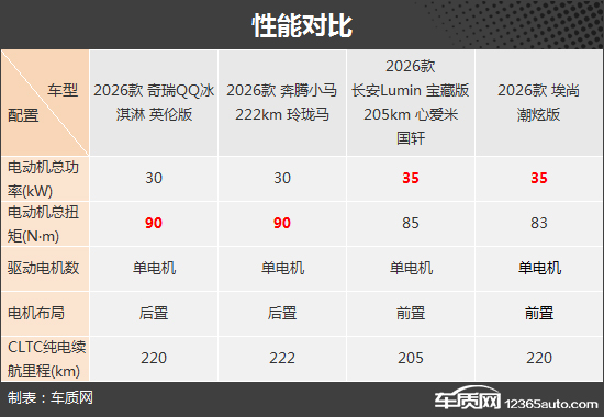 性能方面,四款車型均搭載單電機,不過電機布局有所不同,奇瑞QQ冰淇淋和奔騰小馬為后置,長安Lumin和埃尚為前置。此外,四款車型的電動機總功率、總扭矩以及CLTC純電續(xù)航里程差別不大,均能滿足日常代步需求。
