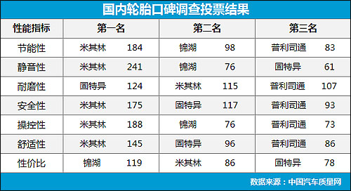 自2013年3月起至今,中國汽車質(zhì)量網(wǎng)啟動的國內(nèi)輪胎品牌口碑調(diào)查已有近3個月的時間,以下是截至6月19日下午3時的投票結(jié)果: 米其林綜合性能突出 優(yōu)勢地位得以鞏固 從投票結(jié)果看,與第一次調(diào)查小結(jié)(國內(nèi)輪胎口碑調(diào)查月度小結(jié) 米其林領跑)類似,米其林在...