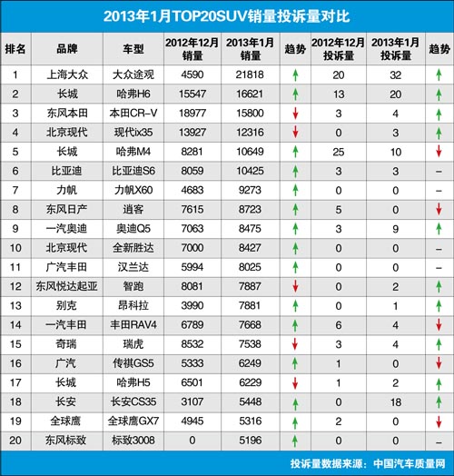 2013年1月TOP20SUV銷量投訴量對應(yīng)點(diǎn)評