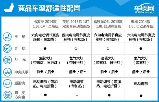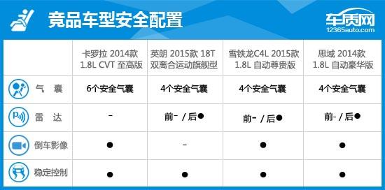 2014款卡羅拉早在去年6月就已問世,但與2015年新上市的車型對比來看,優(yōu)勢依然明顯。1.8L發(fā)動(dòng)機(jī)的動(dòng)力與1.4T渦輪增壓發(fā)動(dòng)機(jī)表現(xiàn)無異,2700mm的軸距表現(xiàn)足以讓卡羅拉傲視同級。而6安全氣囊也在競品車型中獨(dú)樹一幟,保證駕駛者的每一次出行。但是頂配車型的大燈依然采用鹵素光源,讓人不免心生遺憾。同時(shí),因配備了倒車影像功能而取消前后駐車?yán)走_(dá)的做法,實(shí)在令人難以理解。