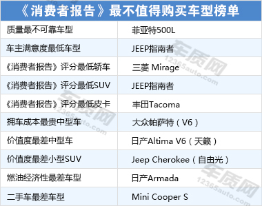 美國《消費(fèi)者報(bào)告》近期從可靠性、滿意度、車主評(píng)分、擁車成本、價(jià)值度、燃油經(jīng)濟(jì)性等方面選出十款不值得消費(fèi)者購買的車型,其中包括過去一年銷量猛增而且目前營銷戰(zhàn)打的火熱的Jeep熱門車指南者、自由光。另外,包括菲亞特500L、Mini Cooper S、大眾帕...