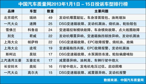 中國汽車質(zhì)量網(wǎng)2013年1月上半月投訴排行
