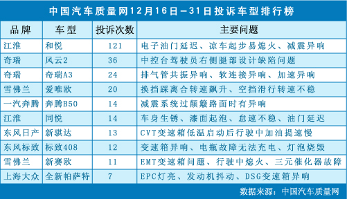 中國汽車質(zhì)量網(wǎng)12月下半月投訴車型排行榜