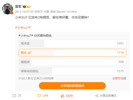 今早,小米CEO雷軍通過微博發(fā)起投票,稱“小米SU7已發(fā)布3種顏色,都非常好看,你會買哪種?”