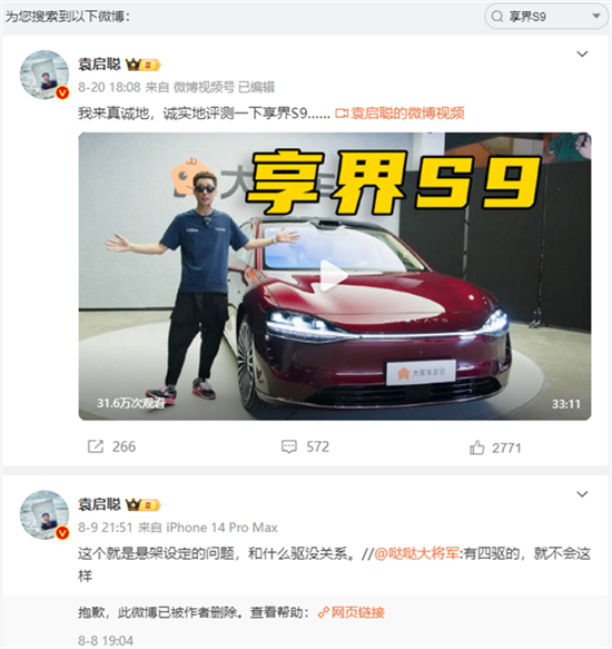 一個(gè)星期過去后,袁啟聰?shù)奈⒉┵~號(hào)目前已經(jīng)解封,不過搜索其和享界S9的相關(guān)內(nèi)容,只剩下一開始發(fā)布的測(cè)試視頻,其余的內(nèi)容基本全部刪除,包括他在對(duì)線時(shí)發(fā)布的種種具有挑釁意味的言論。