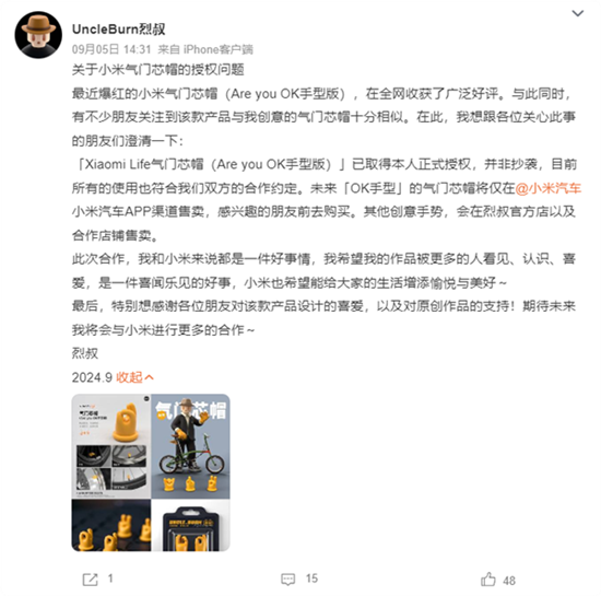 據(jù)了解,UncleBurn烈叔在微博發(fā)文,稱(chēng)“Xiaomi Life氣門(mén)芯帽(Are you OK手型版)已取得本人正式授權(quán),并非抄襲,目前所有的使用也符合我們雙方的合作約定!