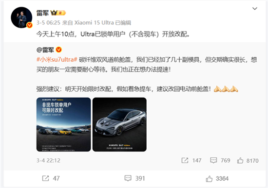 3月5日,雷軍表示,今日上午10點Ultra已鎖單用戶(不含現(xiàn)車)開放改配。