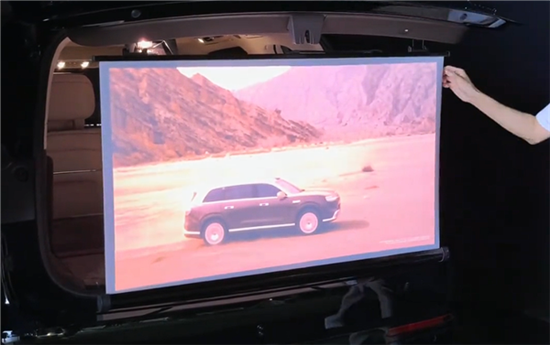 其幕布為透明材質(zhì),通過磁吸鏡頭將車內(nèi)光機的光反向投射到幕布上,畫面可正常顯示,還配備防風(fēng)桿,適合戶外露營使用。