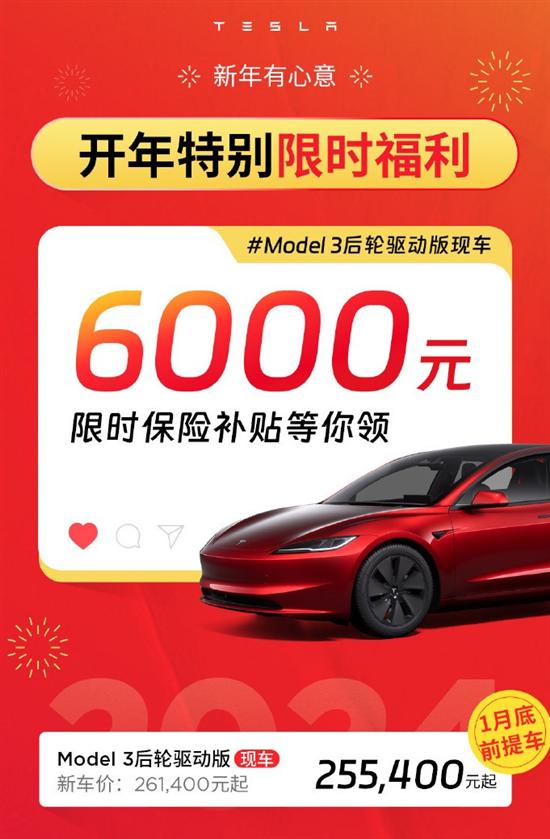 2024年1月1日,特斯拉官方宣布新年限時福利,Model 3后輪驅動版現(xiàn)車保險補貼6000元,1月底前提車25.54萬起。特斯拉同時推出新年低息金融政策,購買Model 3/Y最高可省2.3萬元。其中,Model 3/Y 1月底前提車年費率低至1.99%,Model S/X 3月底前提車年費率低至2.5%。