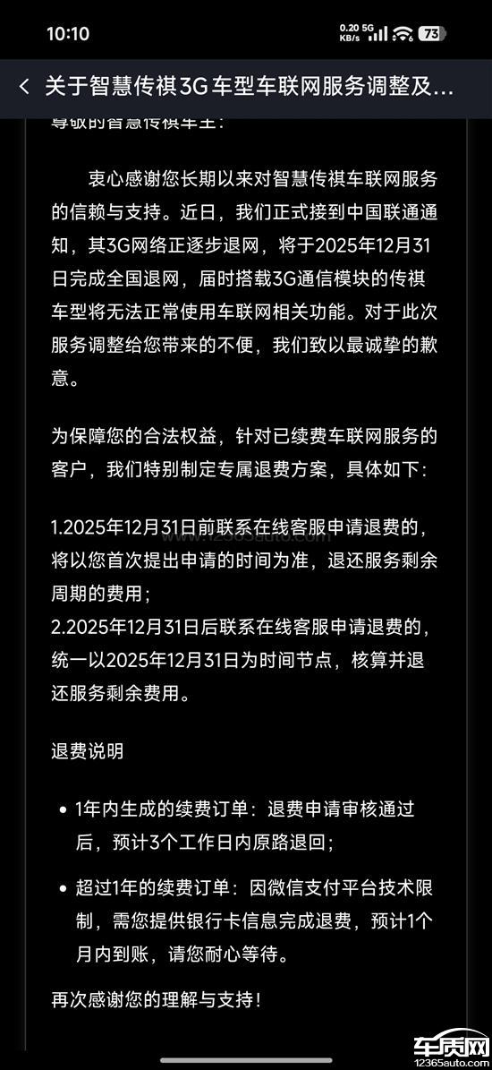 購(gòu)車時(shí),我選購(gòu)的是豪華智聯(lián)版車型,該版本配備車輛遠(yuǎn)程控制功能,非此版本則無(wú)此功能,且價(jià)格要貴1萬(wàn)元左右。遠(yuǎn)程控制功能每年需續(xù)費(fèi)360元,今年續(xù)費(fèi)時(shí),我發(fā)現(xiàn)續(xù)費(fèi)端口不見了,僅看到一篇關(guān)于3G退網(wǎng)的公告,自12月2日起,遠(yuǎn)程控制功能已無(wú)法使用。我向廠家反饋此問(wèn)題,廠家卻以退網(wǎng)是聯(lián)通運(yùn)營(yíng)商的行為為由,表示無(wú)法解決。要求處理。