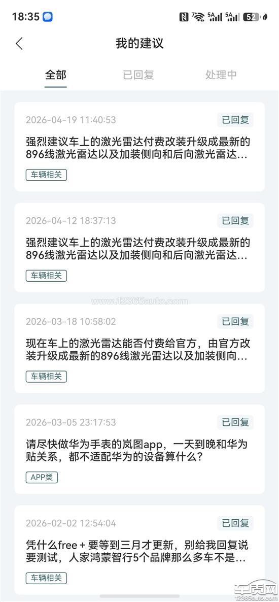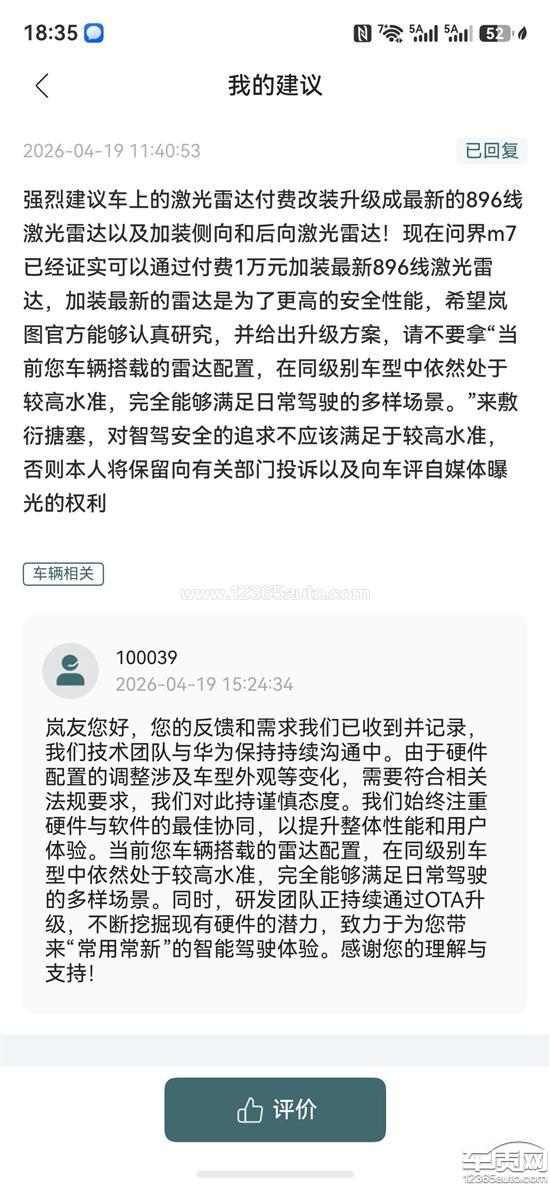 致:嵐圖汽車官方客服中心、嵐圖汽車品牌管理部、嵐圖汽車售后總部 本人系嵐圖FREE+車主,廣大嵐圖FREE+車主提車也就半年多,現(xiàn)就車輛無升級896線激光雷達(dá)方案、無官方解釋與明確方案一事,提出投訴。 一、投訴事由 本人購車時(shí),嵐圖官方以華為乾崑高階智駕、全系激光雷達(dá)為核心宣傳賣點(diǎn),承諾持續(xù)OTA升級、智駕能力不斷迭代,本人基于對品牌與華為智駕生態(tài)的信任選擇嵐圖FREE+。 2026年以來,華為896線激光雷達(dá)落地,同平臺多款車型開放升級,而嵐圖FREE+僅搭載192線激光雷達(dá),硬件不支持升級896線,與用戶期待嚴(yán)不符。且現(xiàn)在問界車系均可升級896線激光雷達(dá) 針對激光雷達(dá)升級本人通過APP多次提出建議,均無明確的官方答復(fù),以“車輛智駕在同級別車型中依然處于較高水準(zhǔn),足以應(yīng)對各類日常駕駛場景。“敷衍,896線激光雷達(dá)是圖像級激光雷達(dá),對車輛最核心的安全性有著極大提升,嵐圖廠家不提供升級方案,嚴(yán)重侵害了車主對車輛安全性的合理訴求。 嵐圖對新車型(如泰山等)搭載896線激光雷達(dá)大力宣傳,卻對老車主的硬件差異、升級權(quán)益閉口不談,存在區(qū)別對待、宣傳與實(shí)際體驗(yàn)脫節(jié)的問題,傷害用戶信任,一邊董事長盧放稱智駕不能只看數(shù)值,一邊又以數(shù)值宣傳自己的旗艦車型泰山,對用戶區(qū)別對待。 二、車主訴求立即給出官方書面說明:明確嵐圖FREE+是否支持896線激光雷達(dá)硬件升級以及給出具體升級方案。建立有效溝通渠道:定期公開進(jìn)展,杜絕推諉拖延。公開透明回應(yīng):針對激光雷達(dá)差異、老車主權(quán)益,向全體FREE+車主統(tǒng)一公告,保障知情權(quán)。 三、聲明 本人保留向12315、汽車投訴平臺、媒體進(jìn)一步維權(quán)的權(quán)利,懇請嵐圖汽車重視用戶訴求,盡快正面回應(yīng)并解決問題,維護(hù)品牌信譽(yù)。